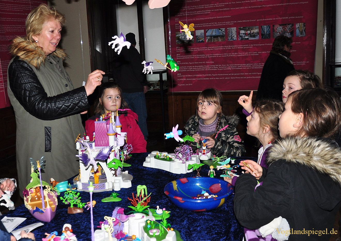 Hortnerin Anne Graul (l.) mit den Elsterberger Kindern in der Playmobil-Ausstellung.