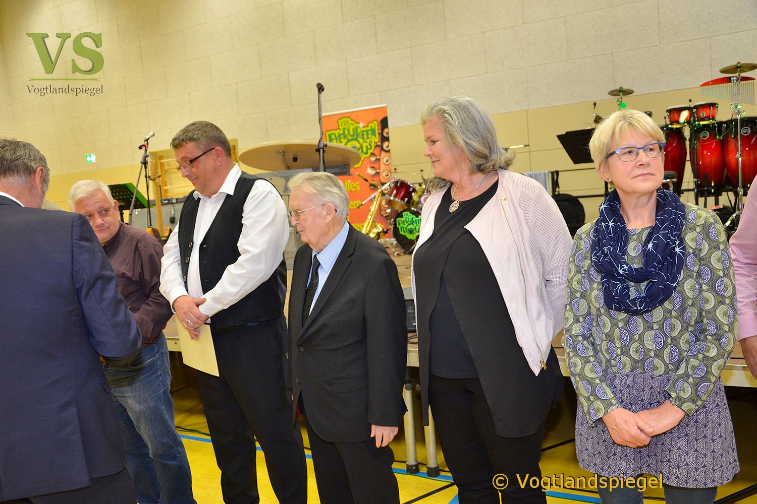 Bürgermeister Gerd Grüner (l.) und Frau Kühn nehmen die Ehrungen der Vereine vor. Hier Bernd Jahn, Thomas Hönsch, Dr. Lothar Hartmann, Martina Högger und Regina Golombek.