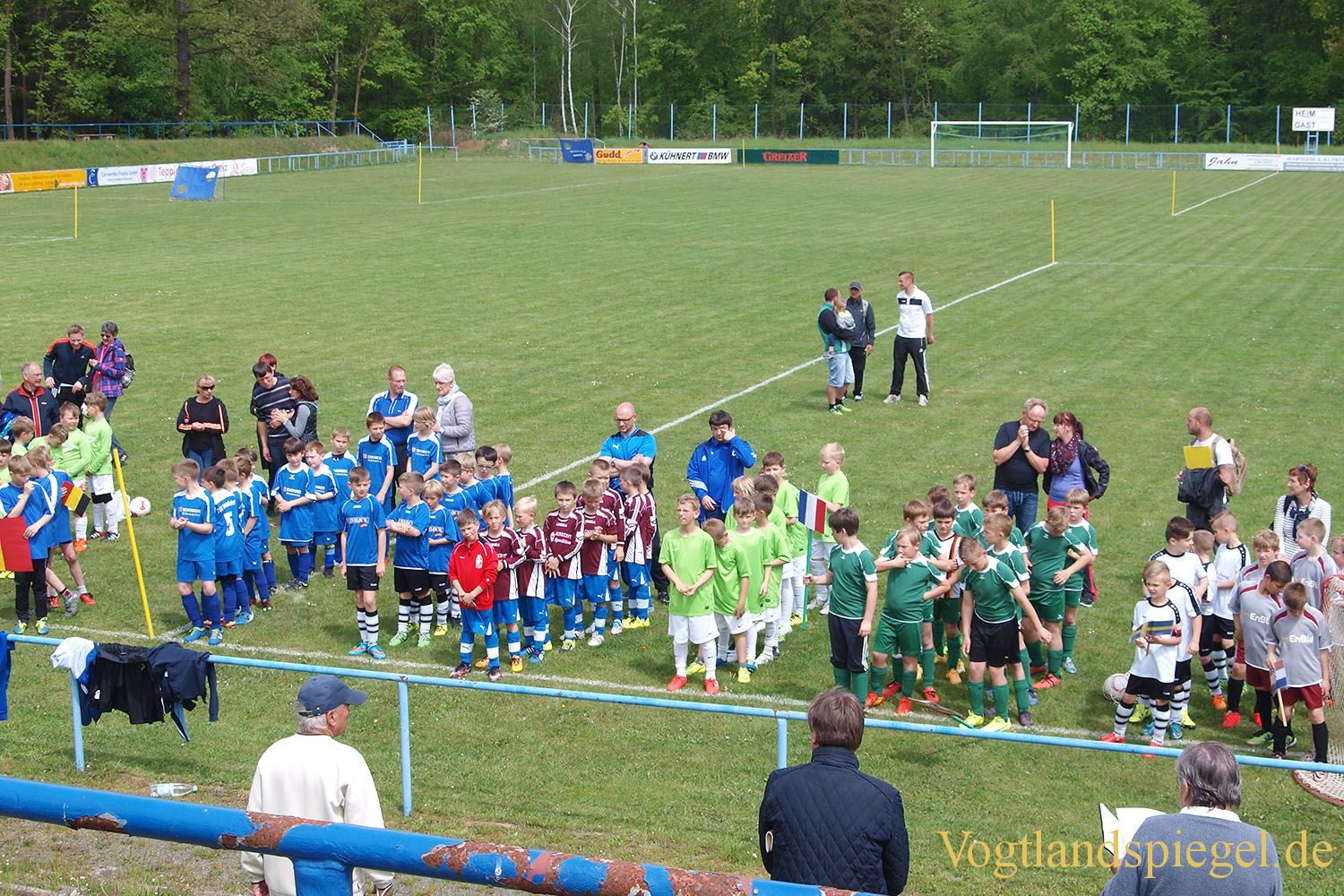 Die an der Mini-EM teilnehmenden Mannschaften haben im Stadion auf dem Tempelwald Aufstellung genommen.