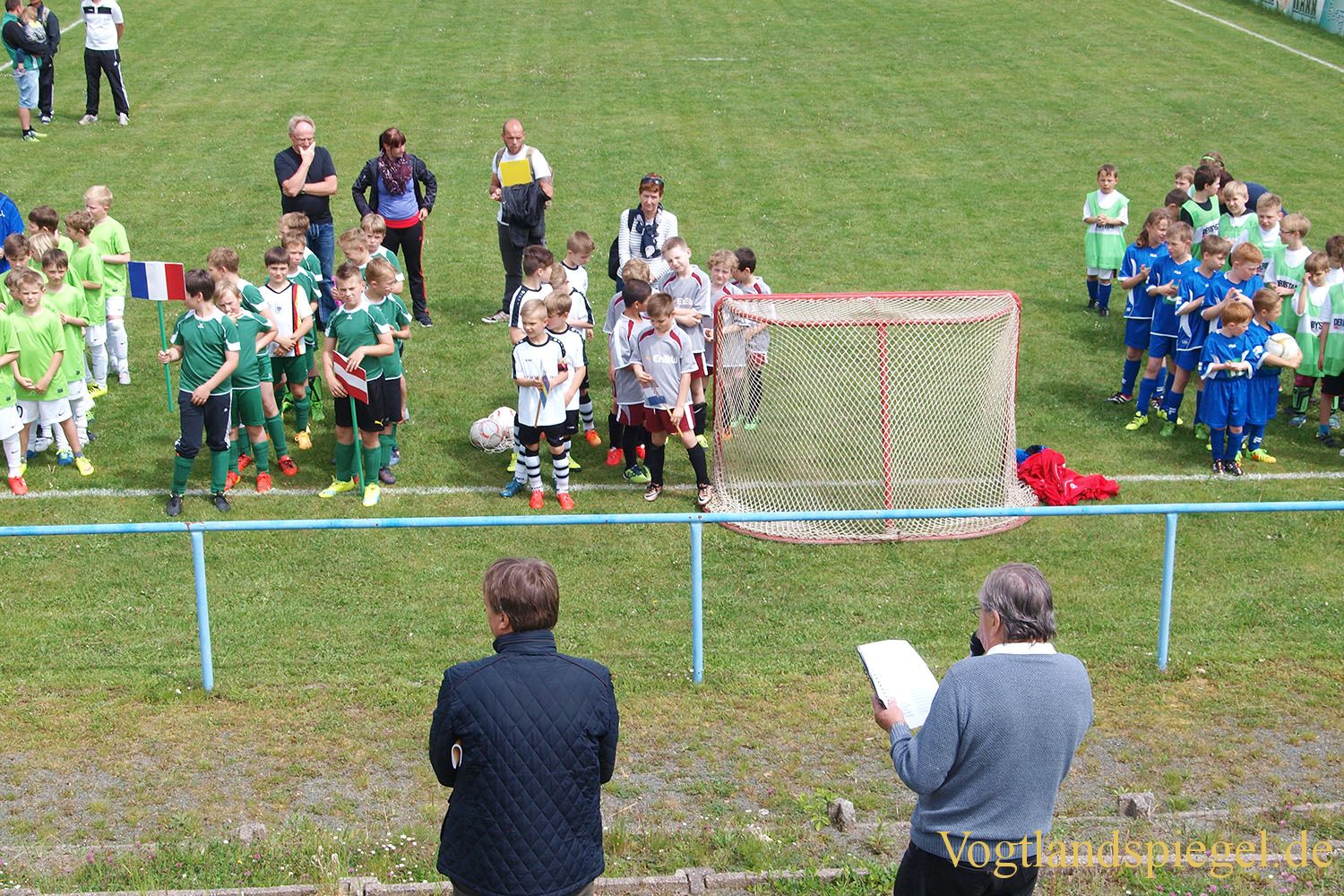 Peter Reichardt (vorn rechts) begrüßt die Teilnehmer der Mini-EM im Fußball im Rahmen der Kreisjugendspiele des Landkreises Greiz 2016.