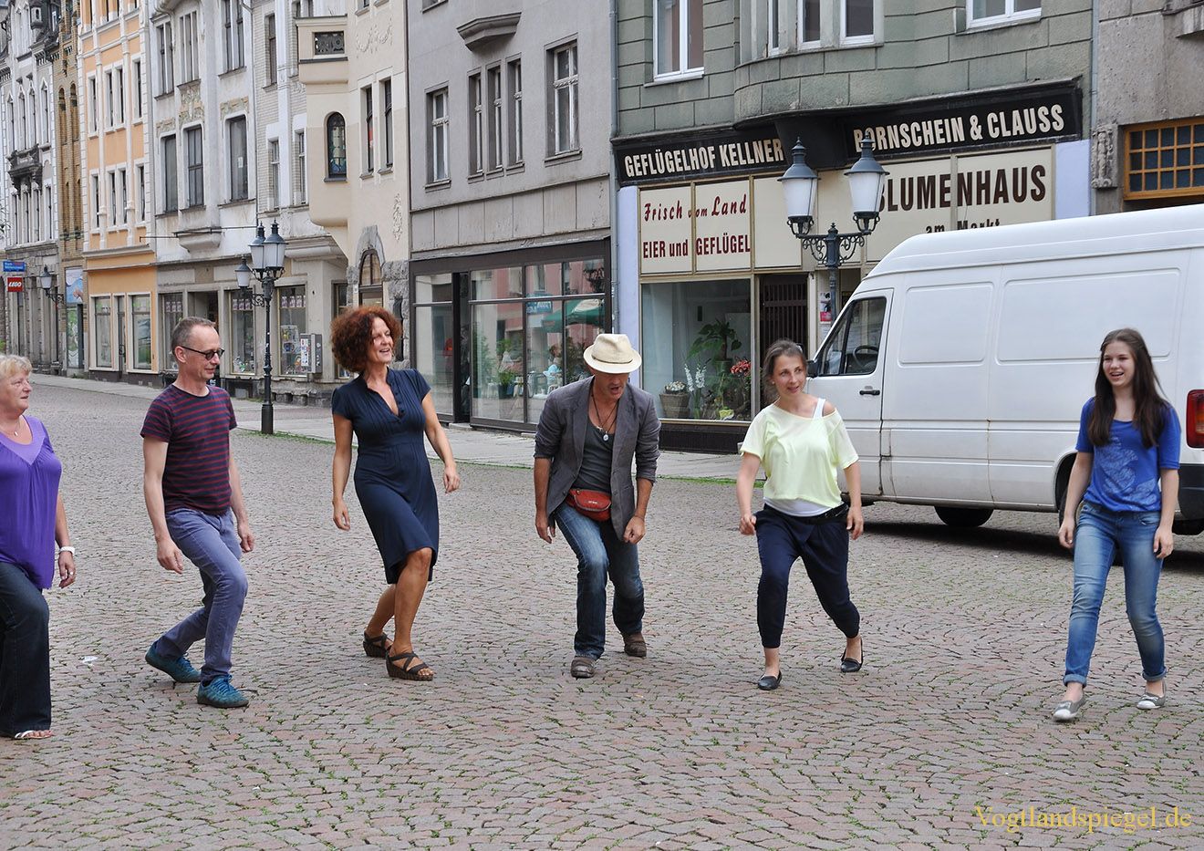 Eröffnungswerkstatt des Theaterherbstes probt auf Greizer Markt