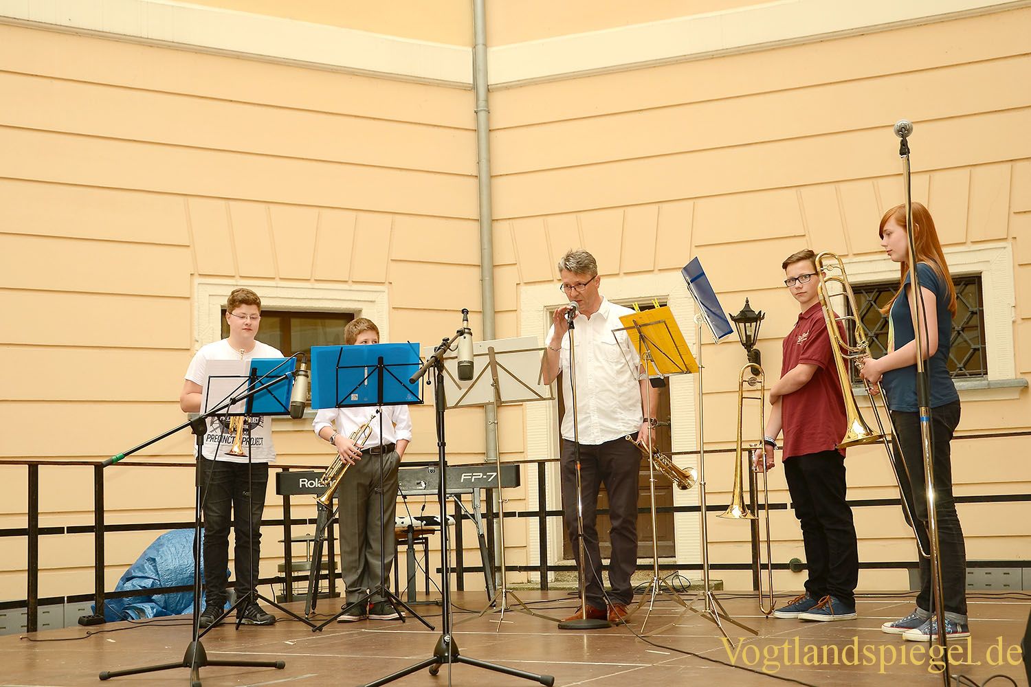 Auf der Bühne im Schlosshof ist „Unterhaltsames zur besten Stunde“ zu hören – hier Matthias Härtig und das Bläserensemble der Kreismusikschule Greiz