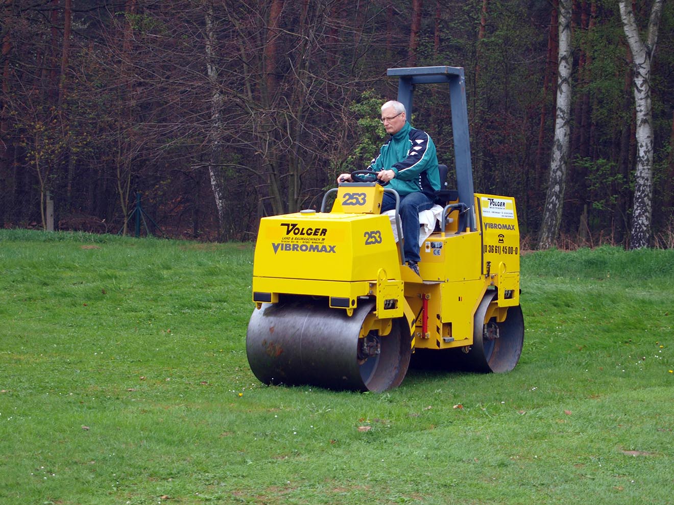 Mit dem Traktor wird der Rasen des Gommlaer Sportplatzes gewalzt.