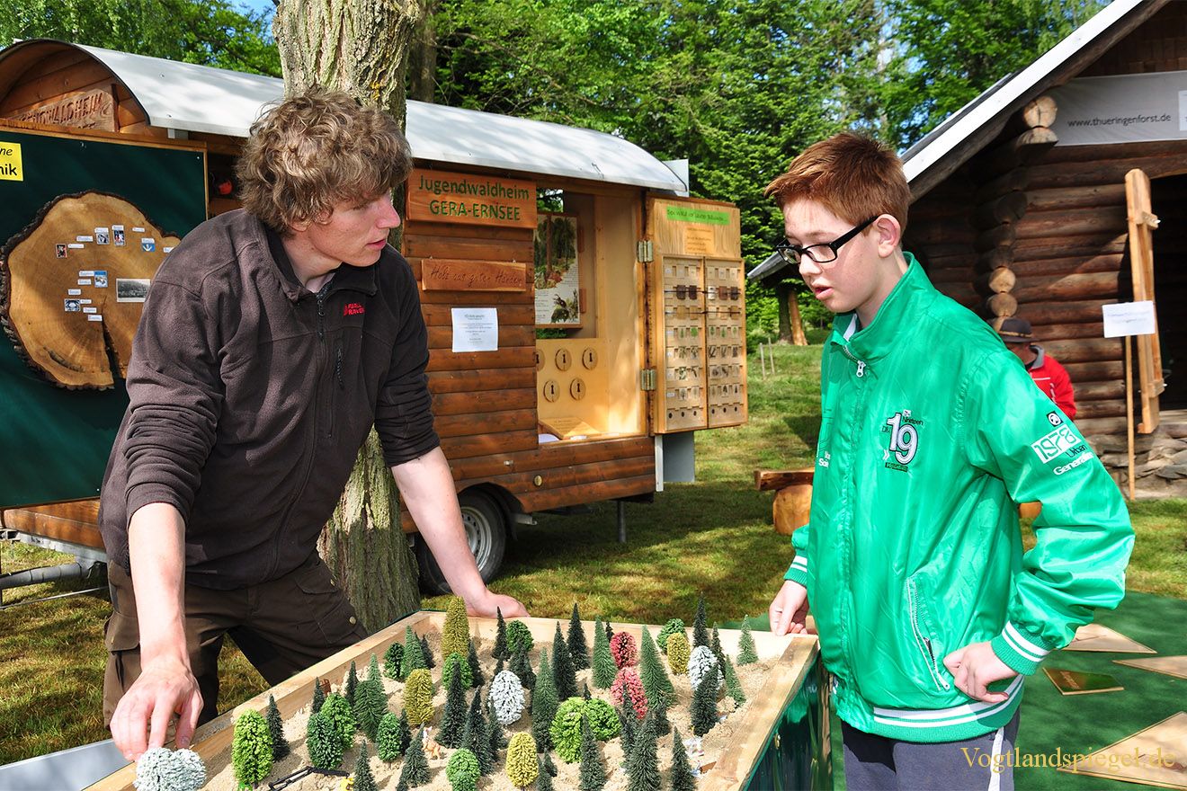 Maximilian Dziabel (r.) informiert sich bei Jonas Fischer vom Jugendwaldheim Gera-Ernsee.