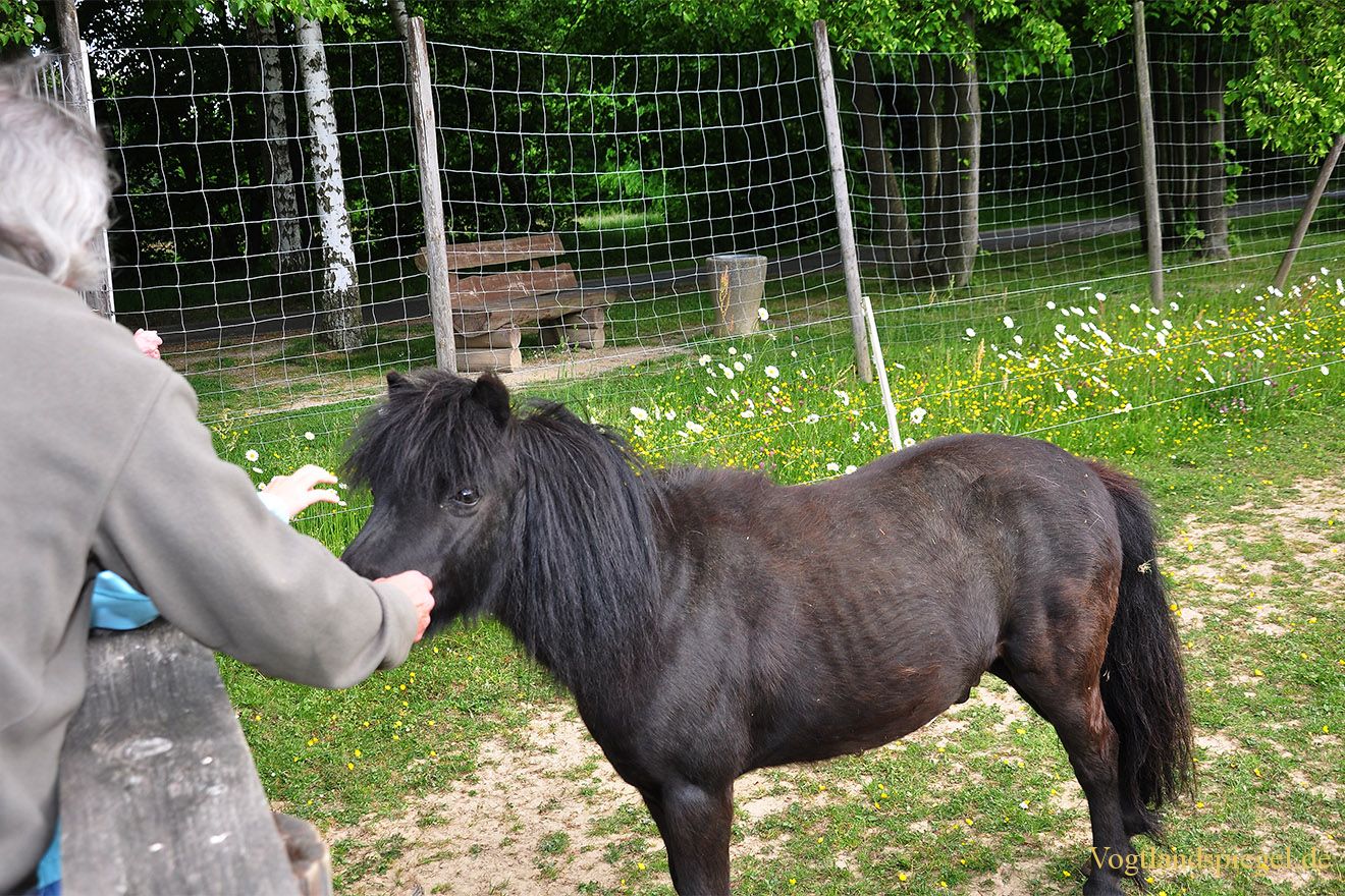 Das Shetlandpony kommt zu den Besuchern und lässt sich streicheln.