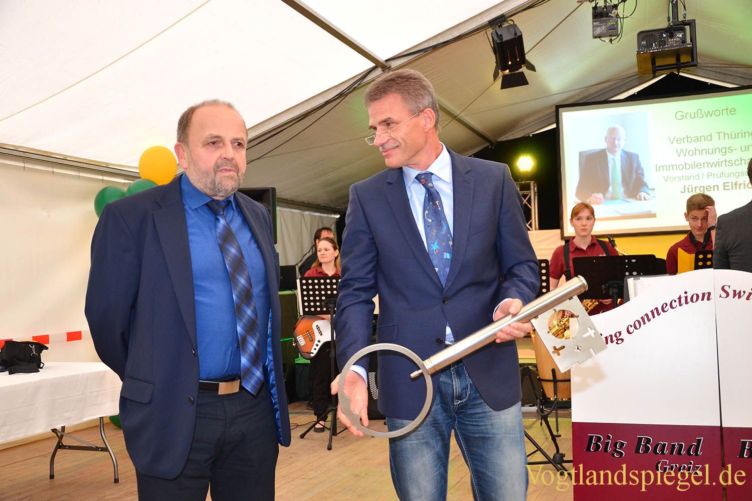 Frank Schubert (l.) und steffen Dinkler haben einen großen Schlüssel mitgebracht.