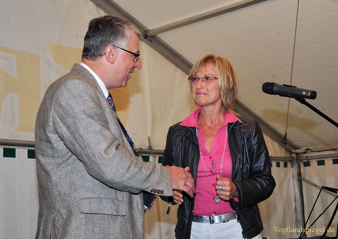 Die 2. Beigeordnete des Greizer Bürgermeisters, Ines Watzek gratuliert dem Vorstandsvorsitzenden des Schwimmklubs, Detlef Zietan zum Jubiläum.