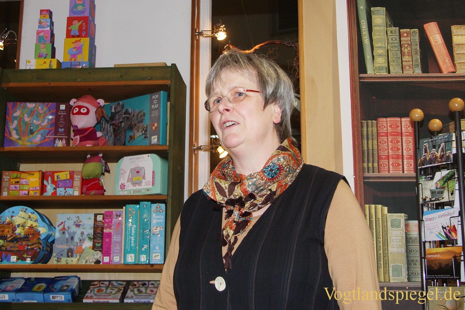 Barbara Jugel begrüßt die Gäste in der Buchhandlung „Bücherwurm“
