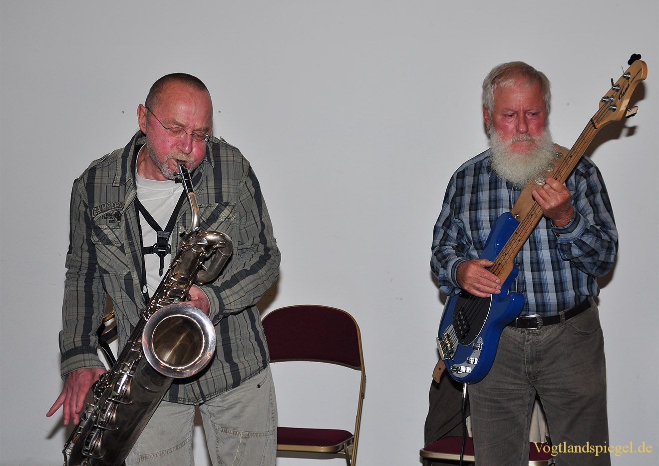 Rudolf Kuhl (l.) und Harald Seidel zur Eröffnung der Ausstellung „Photografie & Lyrik“ in der Vogtlandhalle Greiz.