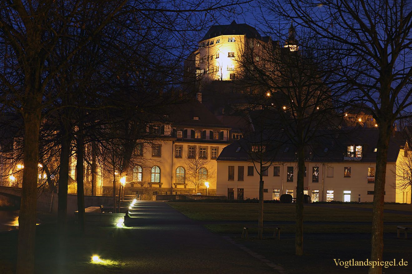 Abendlicher Blick vom Schlossgarten in Richtung Stadtmühle, Sparkassengebäude und Oberes schloss. Aufnahme von Anfang Januar 2016.