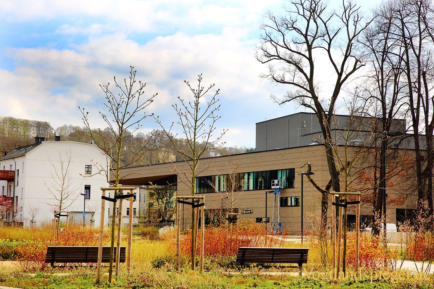 Blick auf die Vogtlandhalle Greiz aus Richtung Goethepark. Aufnahme von Mitte April 2016.