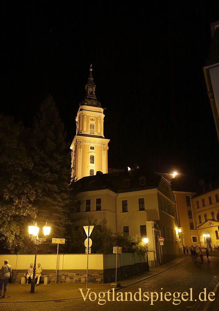 Blick auf die hell erleuchtete Stadtkirche St. Marien.