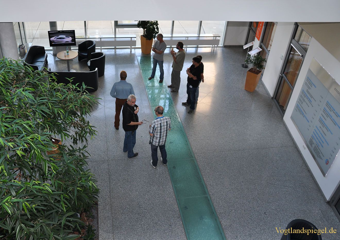 Die Techniker beraten sich im Eingangsbereich des Krankenhauses.