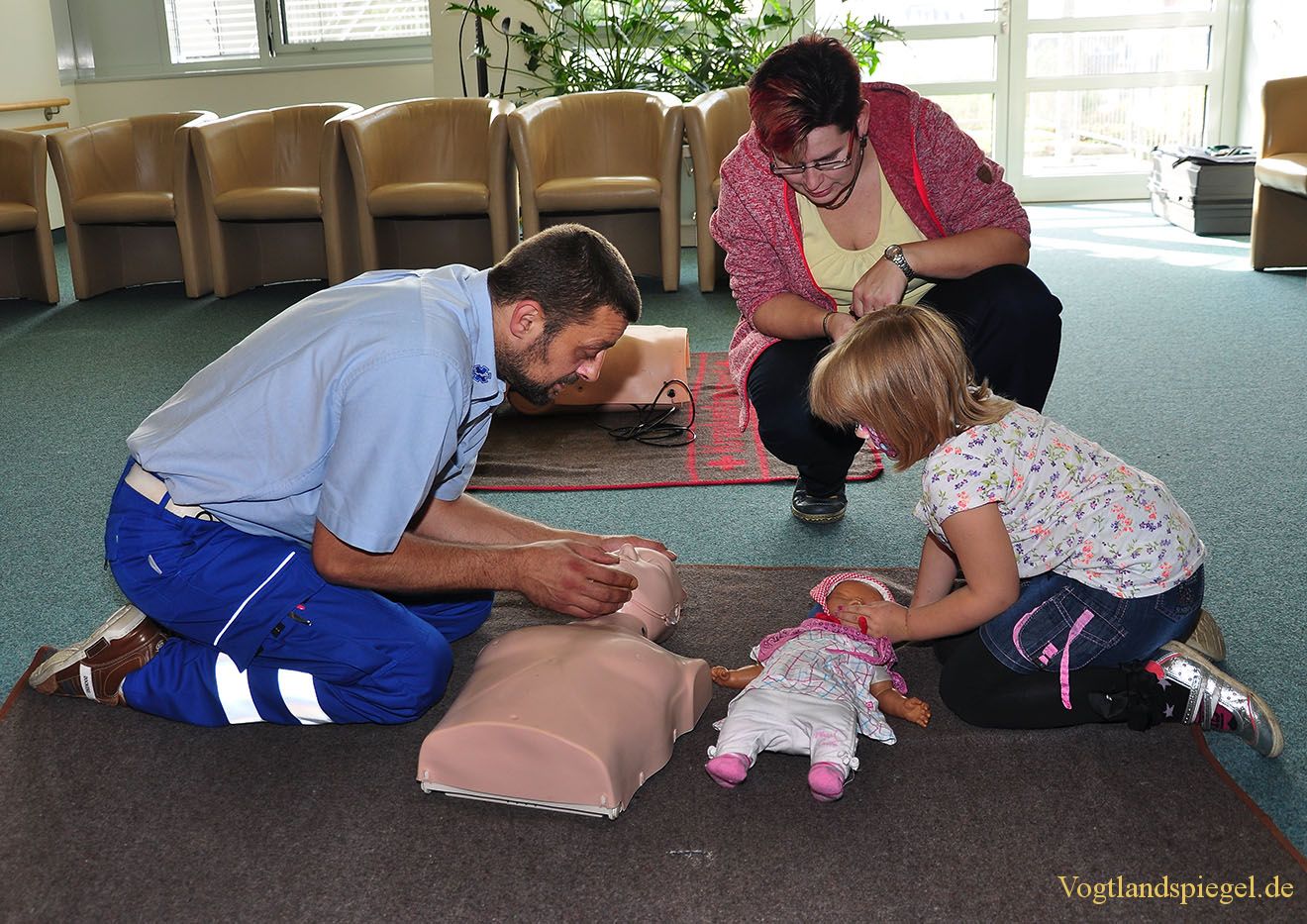Aufmerksam verfolgen Zoe und ihre Mama die Anleitungen zur Reanimierung, die Stan Fankhänel gibt.