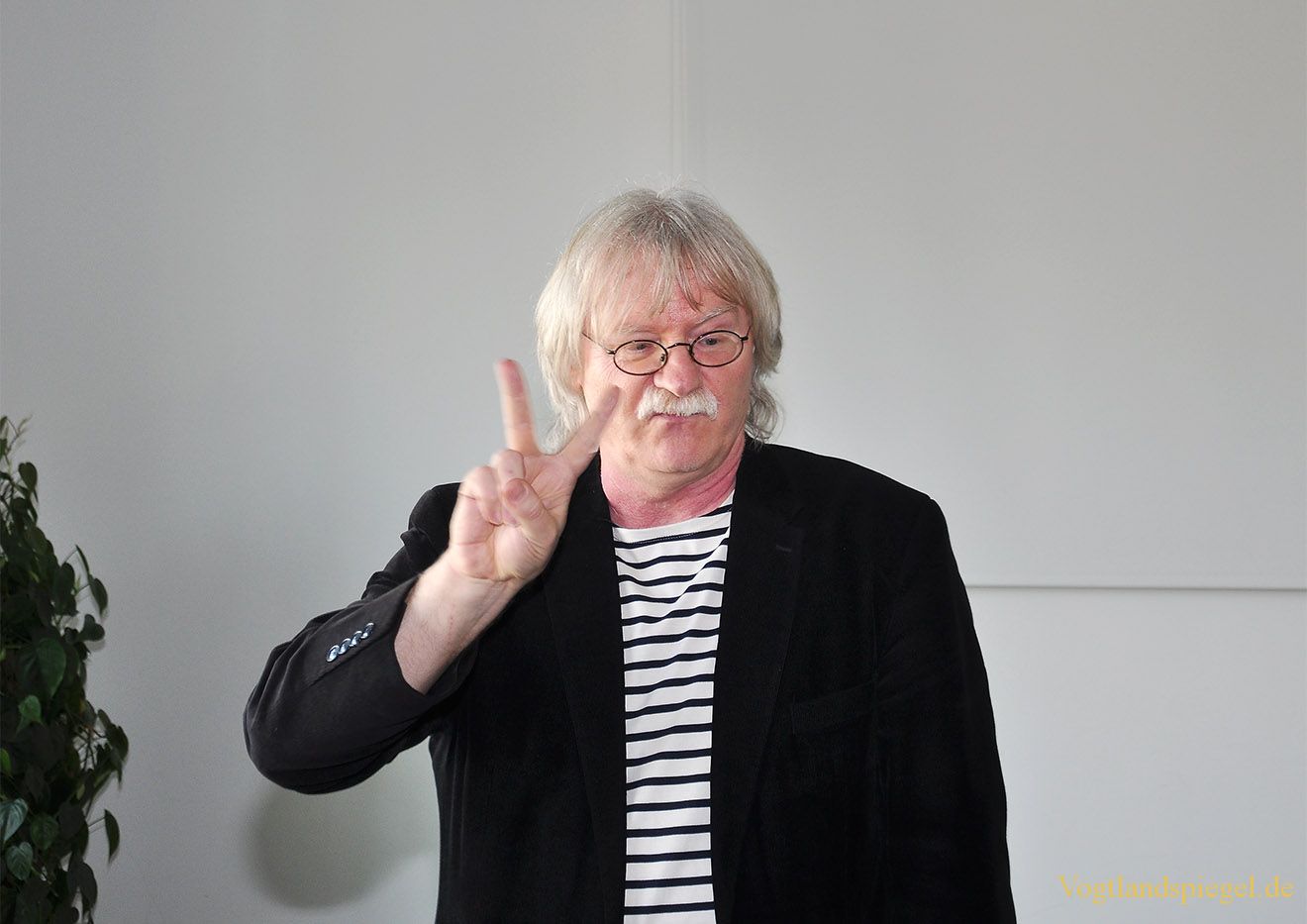 Kabarettist Ulf Annel zeigt ein V für Victory, was aber heute „Peace“ bedeutet.