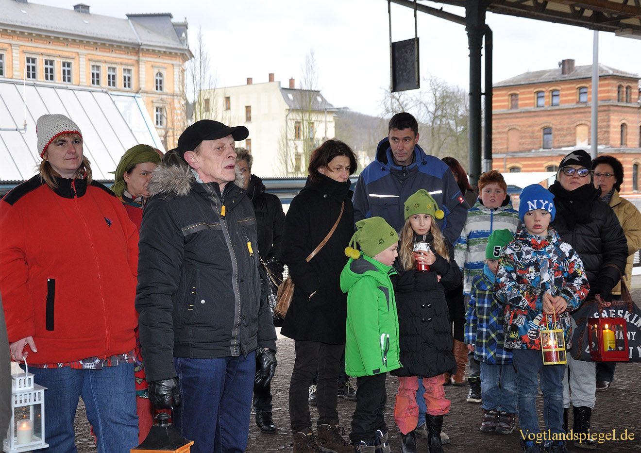 Die Greizer nehmen an der kleinen Andacht auf dem Greizer Bahnhof teil.