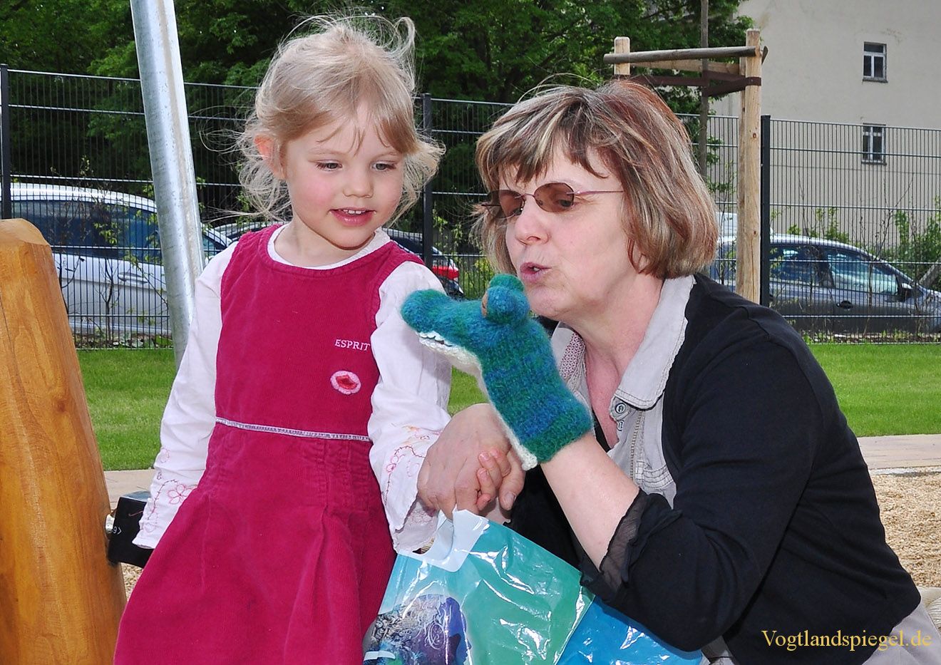 Marlies Grimm schenkt der kleinen Lilith eine Krokodil-Handpuppe.