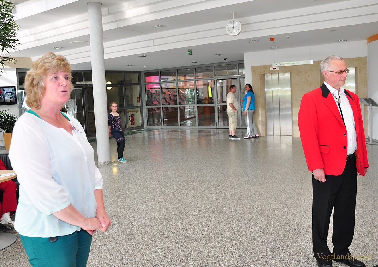 Frau Hartmann begrüßt den Männergesangverein Raasdorf im Foyer des Kreiskrankenhauses Greiz.