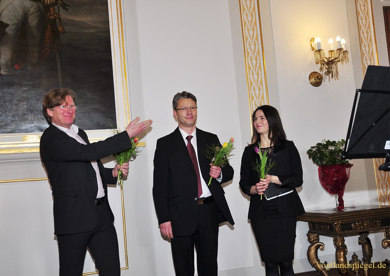 Museumsdirektor Rainer Koch (l.) überreicht Matthias Härtig und Anita Rott einen Blumenstrauß.
