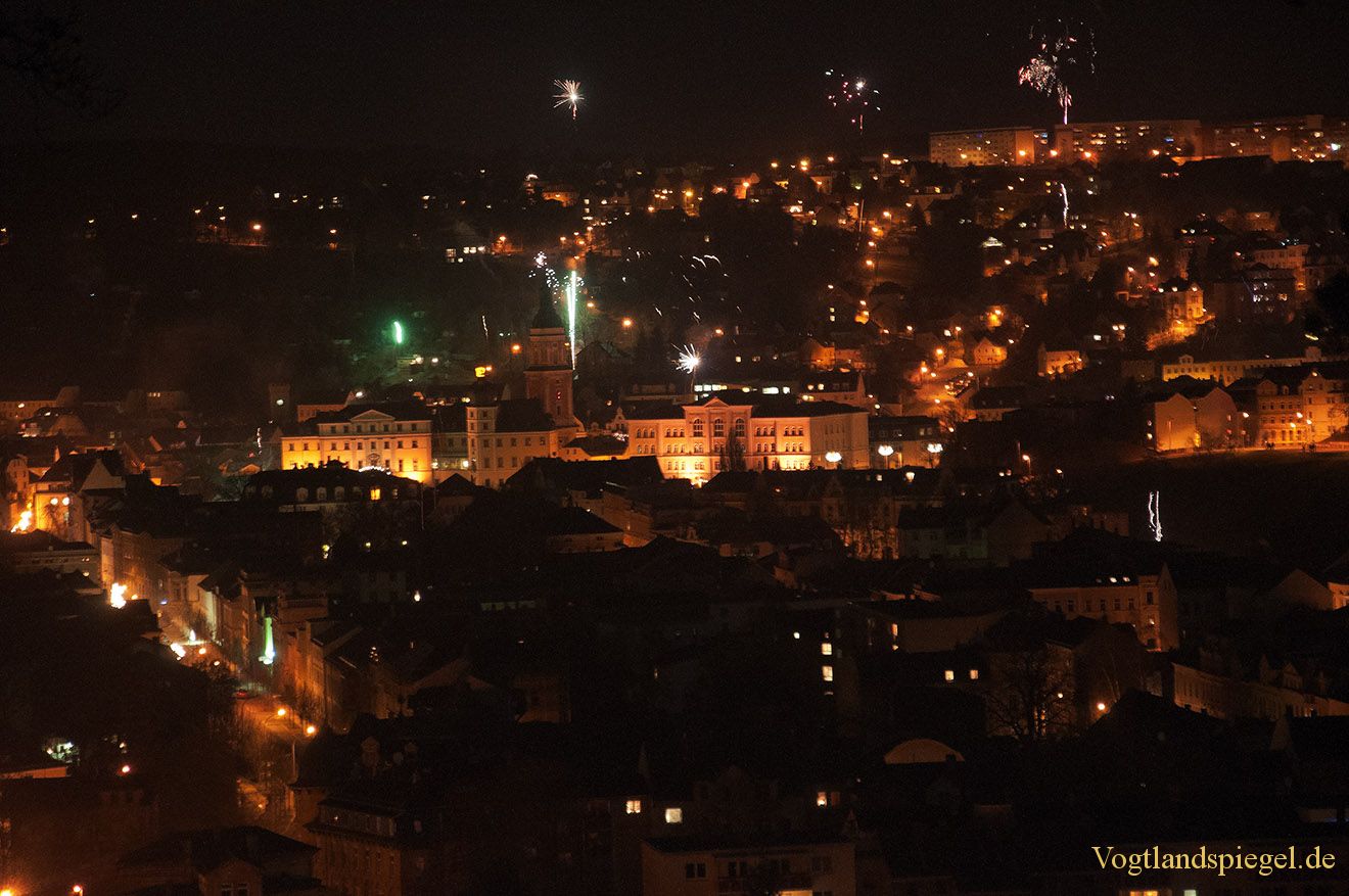 Feuerwerk über der Stadt Greiz – eingefangen vom Gelände der ehemaligen Jugendherberge. Jahreswechsel 2012/2013.