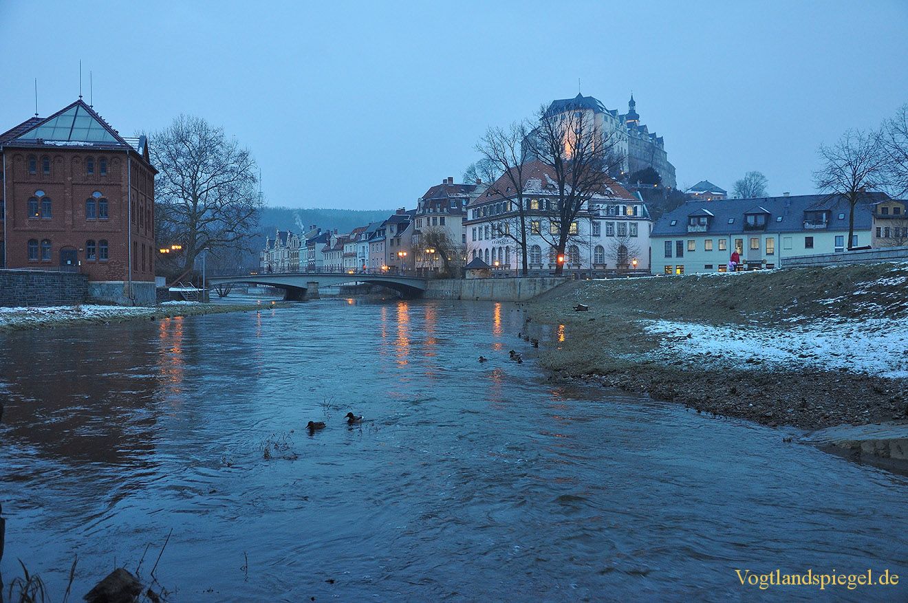 Blick elsterabwärts auf Rotes Haus, Stadtmühle, Sparkasse und Oberes Schloss in Greiz. Aufnahme von Mitte Januar 2013.
