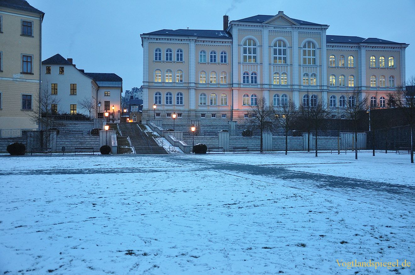 Blick vom verschneiten Greizer Schlossgarten zur Lessing-Regelschule. Aufnahme von Mitte Januar 2013.