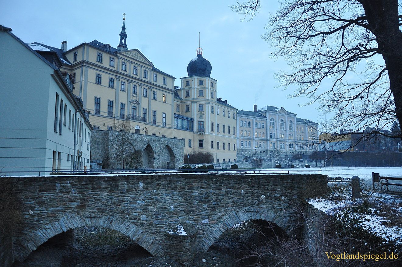Blick über den Stadtmühlengraben zum Unteren Schloss und zur Lessing-Regelschule Greiz. Aufnahme von Mitte Januar 2013.