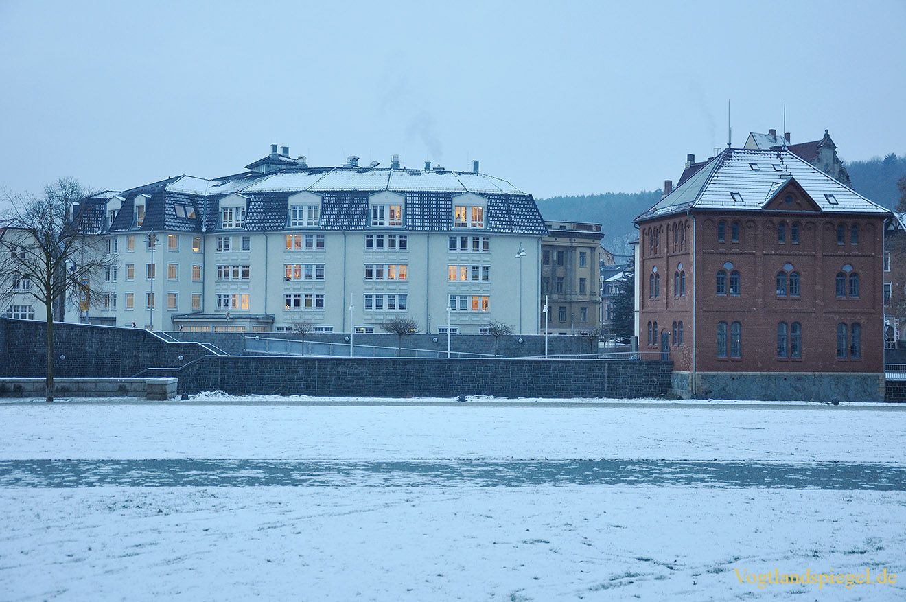 Blick vom verschneiten Greizer Schlossgarten auf das Seniorenwohnzentrum „An der Schlossbrücke“.Aufnahme von Mitte Januar 2013.