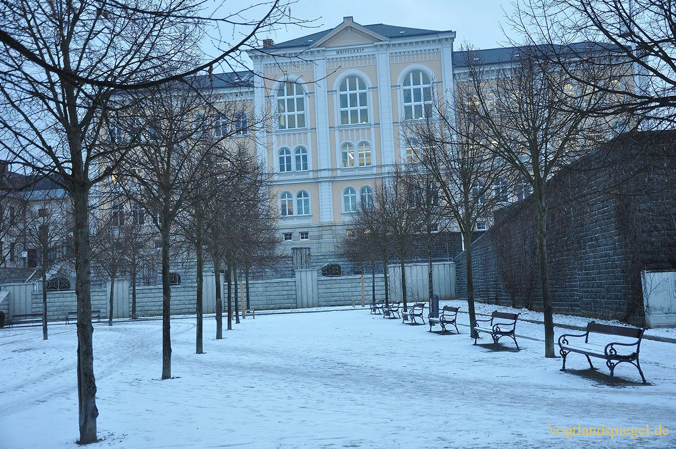 Blick vom verschneiten Schlossgarten auf die Lessing-Regelschule Greiz. Aufnahme von Mitte Januar 2013.