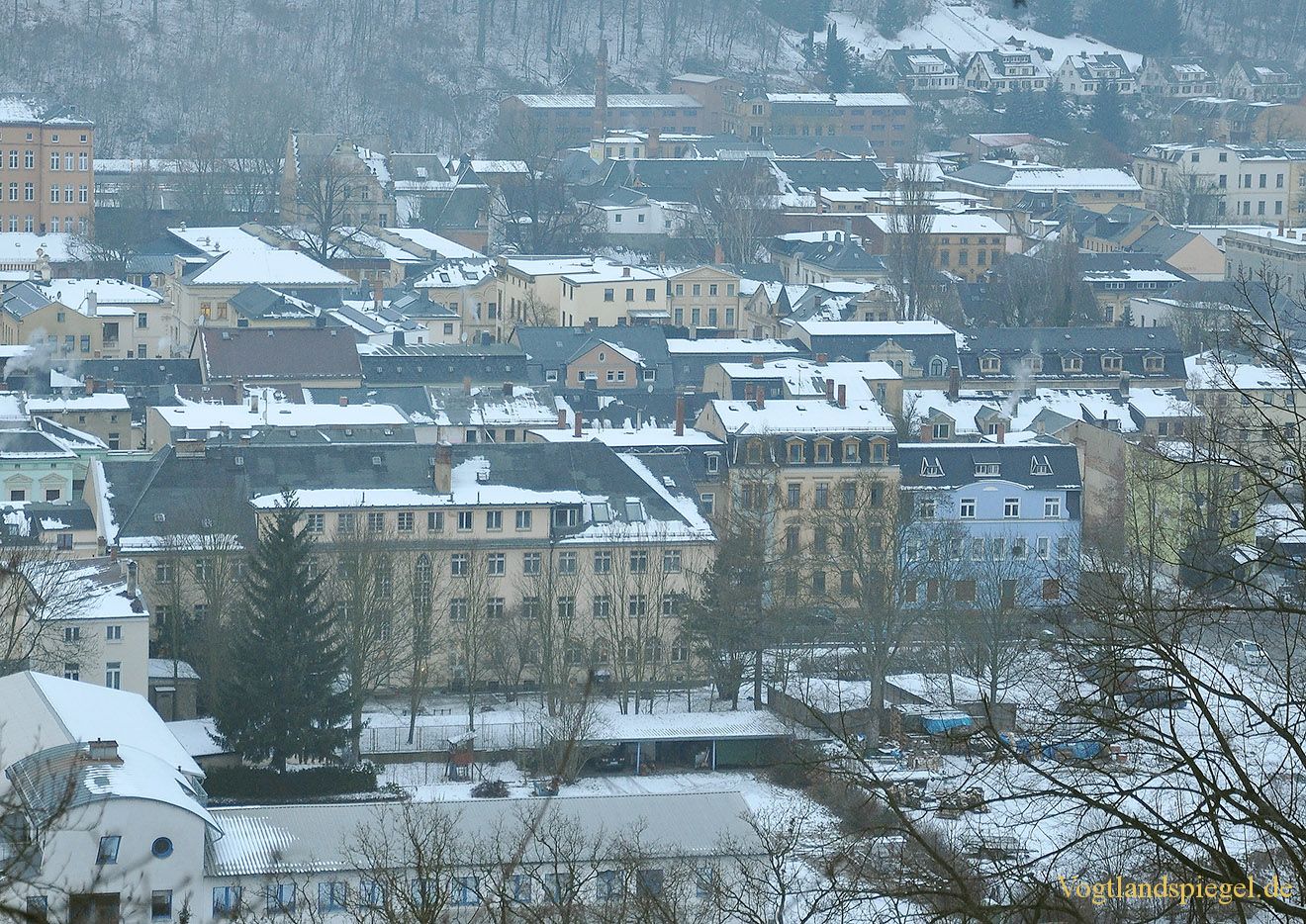 Blick vom Hainberg auf Greiz, vorn Druckerei Tischendorf, dahinter die Rosa-Luxemburg-Straße. Aufnahme von Mitte Januar 2013.