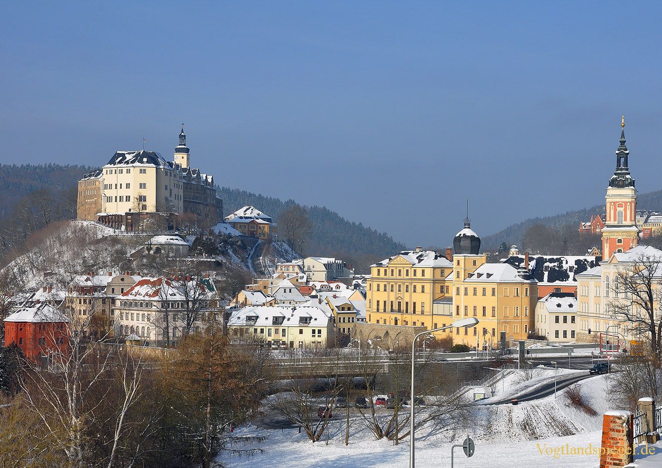 Winterlicher Blick auf das Greizer Obere Schloss und das klassizistische Ensemble. Aufnahme von Ende Januar 2013.