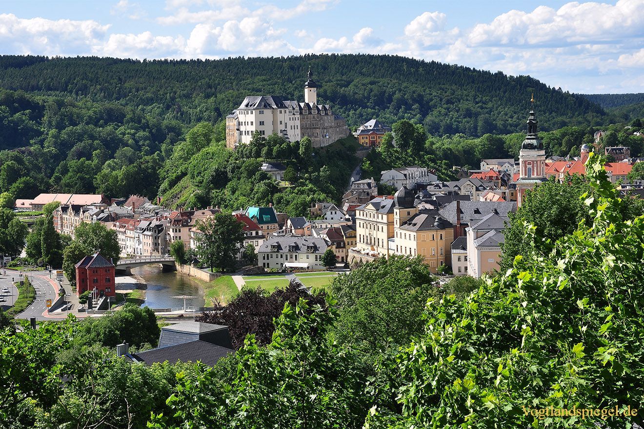 Blick vom Hainberg elsterabwärts auf das Zentrum der Stadt Greiz und das Obere Schloss. Aufnahme von Ende Juni 2013.