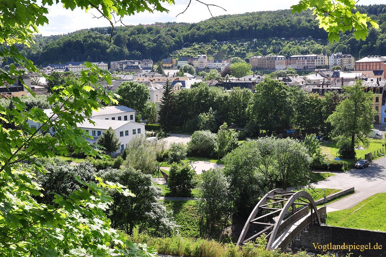 Blick vom Hainberg auf die Hainbergbrücke und links die Druckerei Tischendorf in der Greizer Neustadt. Aufnahme von Ende Juni 2013.