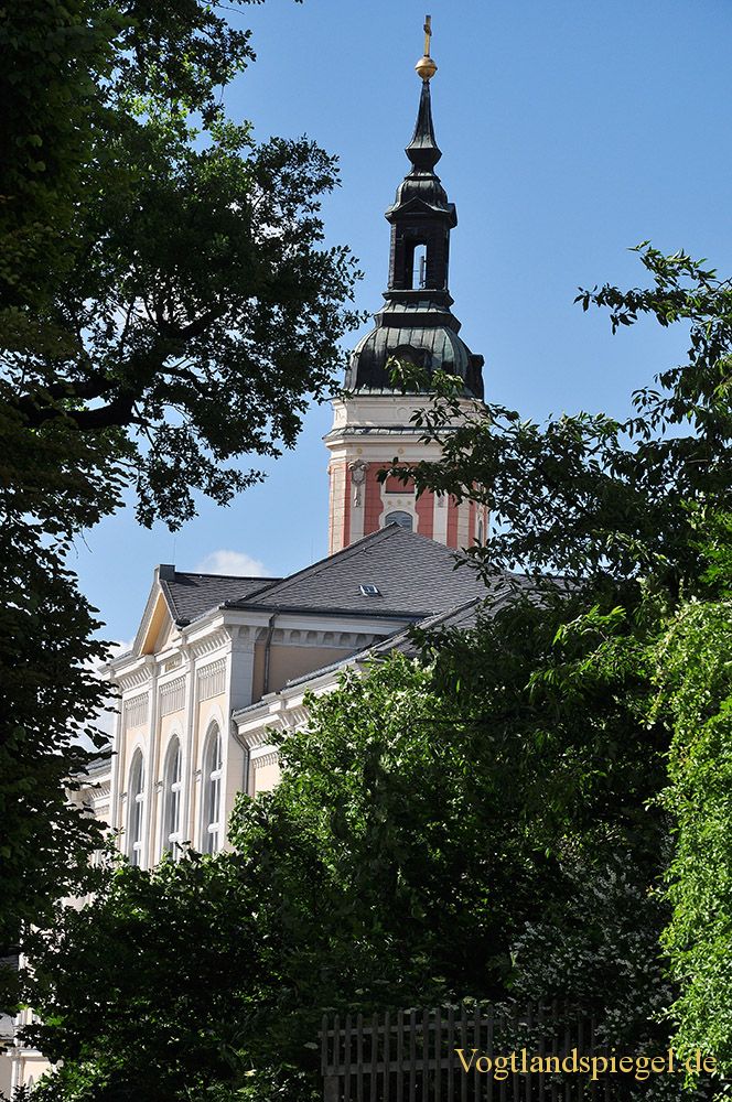 Giebelfront der Lessing-Regelschule und Turm der Stadtkirche St. Marien Greiz. Aufnahme von Ende Juni 2013.