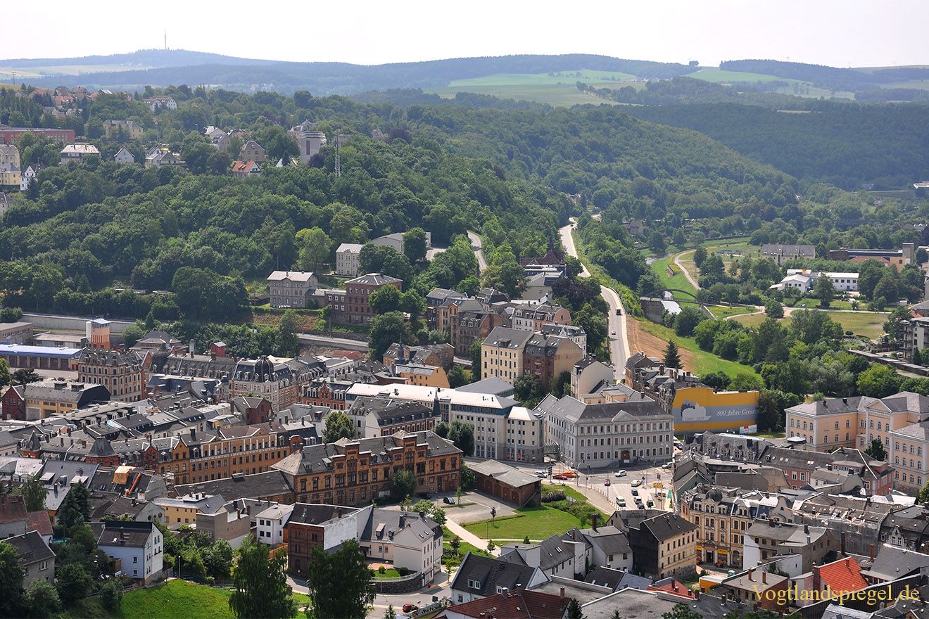Blick vom Kran auf den Greizer Marstall (vorn, M.) und das Landratsamt (vorn re.). Aufnahme von Anfang Juli 2013.