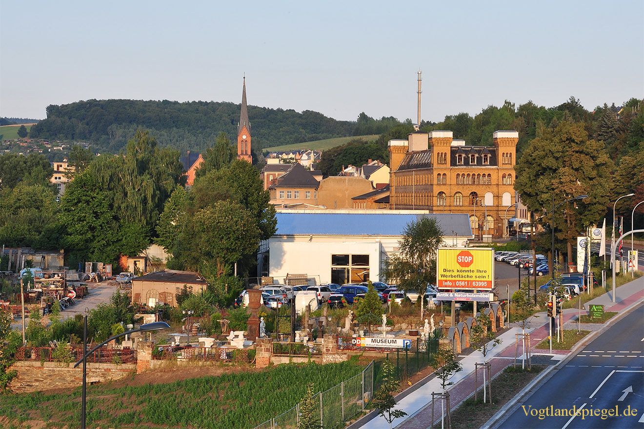 Blick vom Kaufland-Dach auf Antik-Opitz (vorn), Sempuco (r.) und Aubachtaler Kirche. Aufnahme von August 2013.