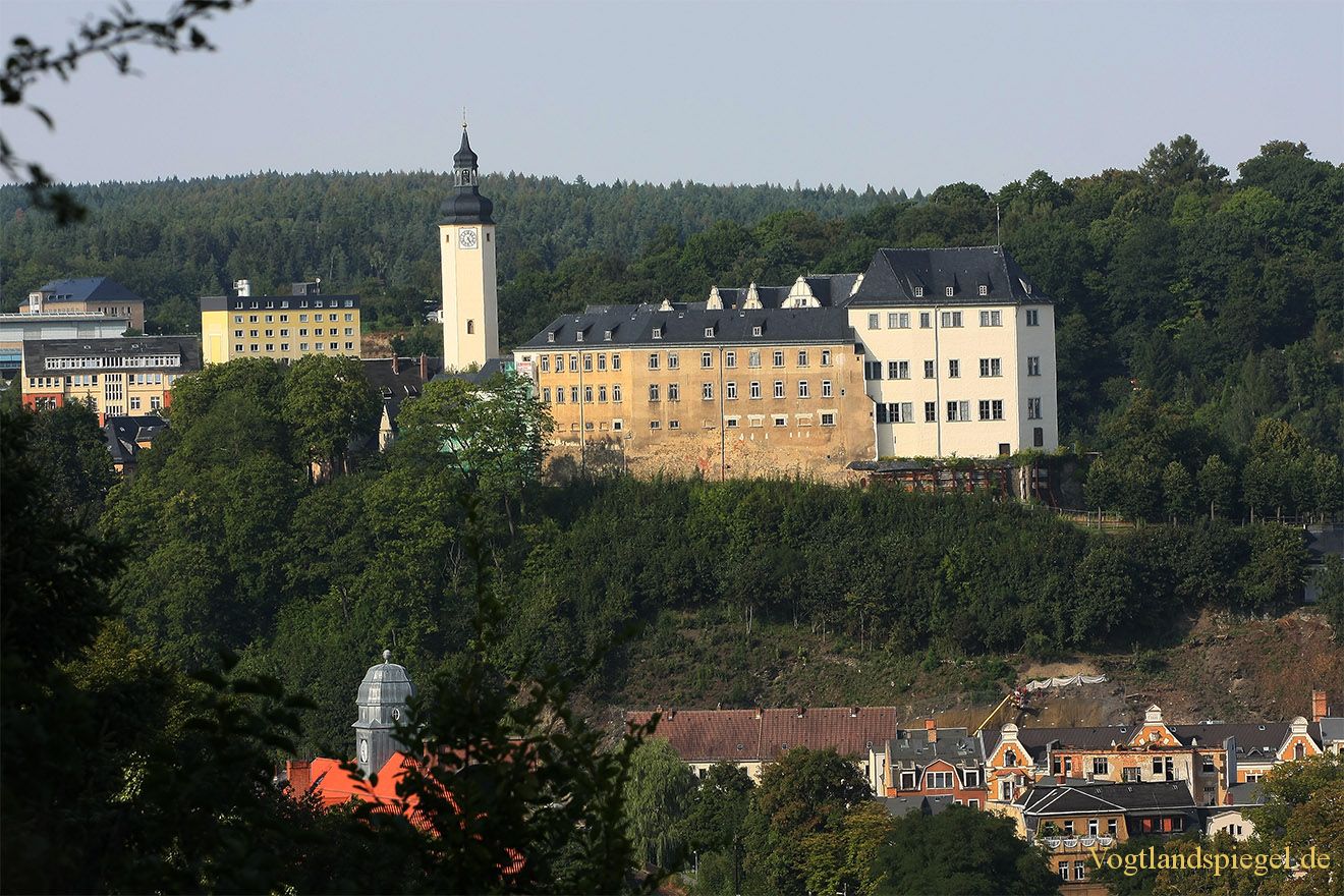 Blick auf das Obere Schloss Greiz und den Komplex der Kreiskrankenhaus Greiz GmbH. Aufnahme von Ende August 2013.