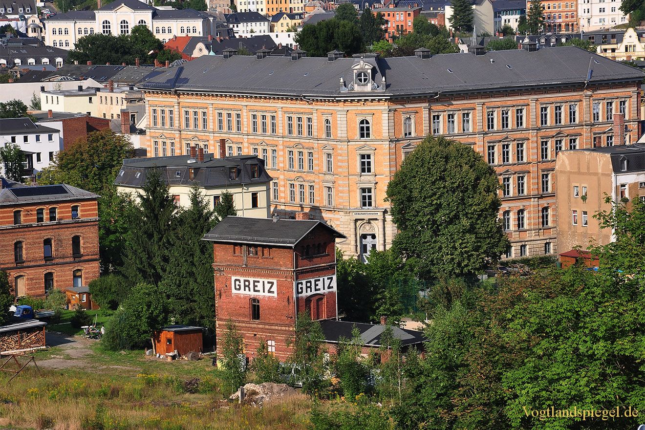 Bahnstationshaus Greiz (Vordergrund) dahinter das Ulf-Merbold-Gymnasium. Aufnahme von Ende August 2013.