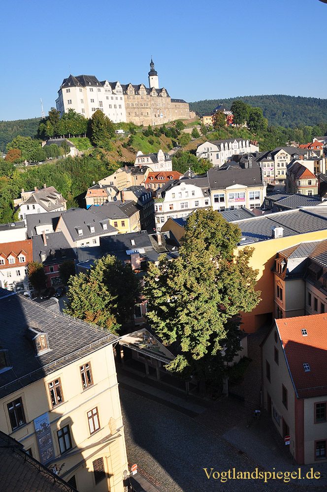 Blick vom Greizer Kirchturm in Richtung Oberes Schloss Greiz. Aufnahme von Anfang September 2013.