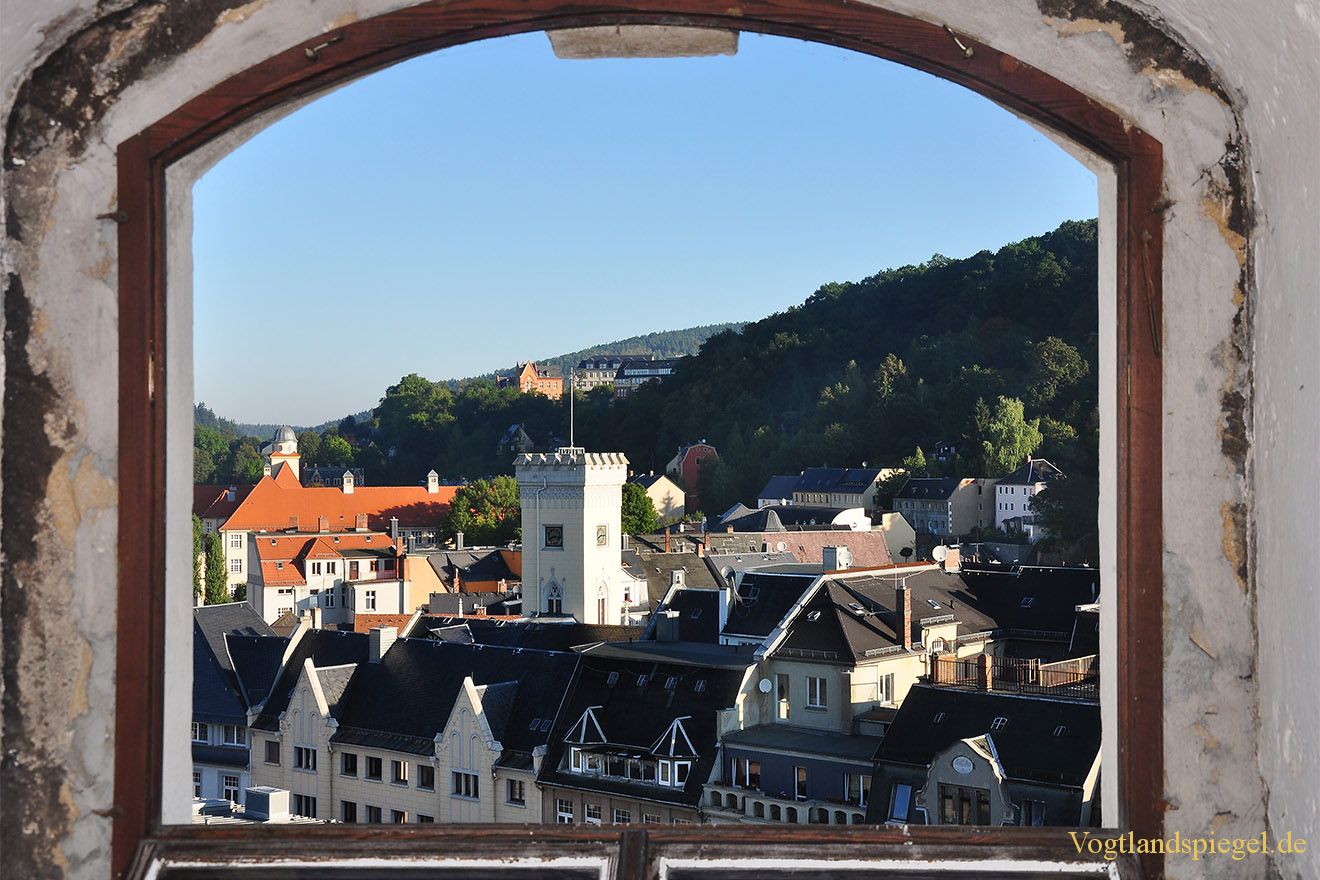 Blick aus der Türmerwohnung der Stadtkirche St. Marien in Richtung Rathaus Greiz. Aufnahme von Anfang September 2013.