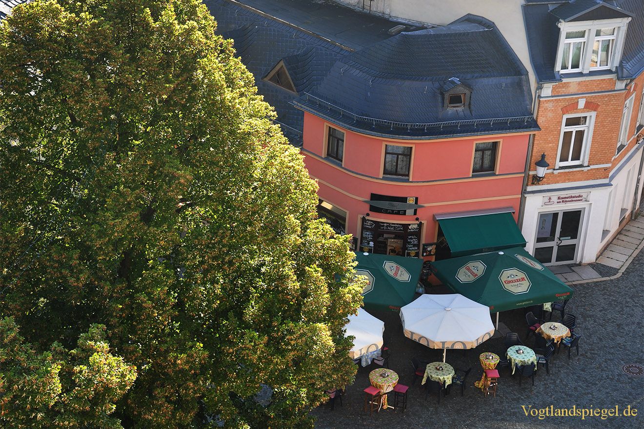 Blick vom Kirchturm auf den Greizer Kirchplatz mit Café „Schwarzer Engel“. Aufnahme von Anfang September 2013.