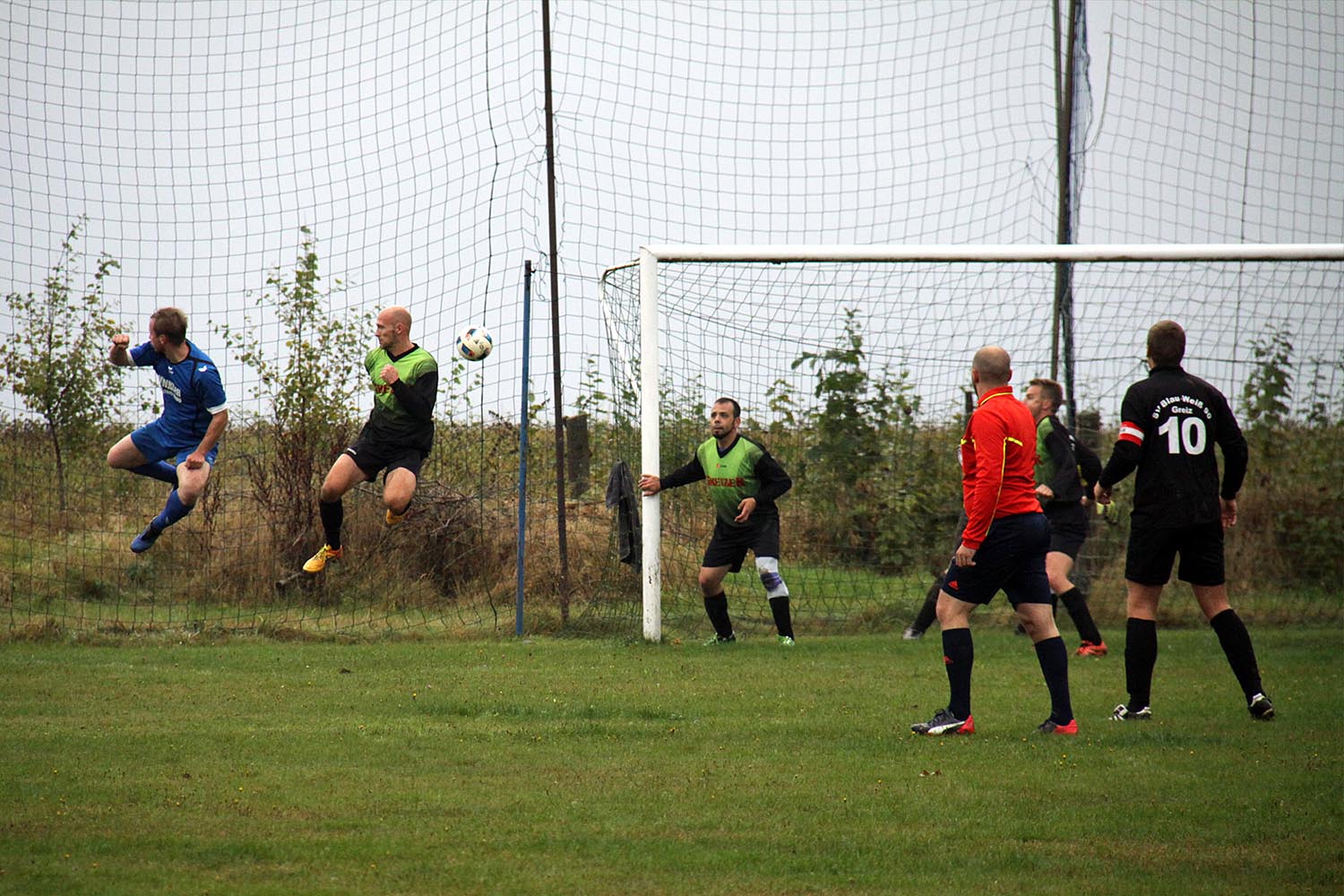 Durch einen Hackentrick versuchte der Westvororte-Spieler den Ball an den ebenfalls emporsteigenden Norman Voss vorbei zu schlänzen.