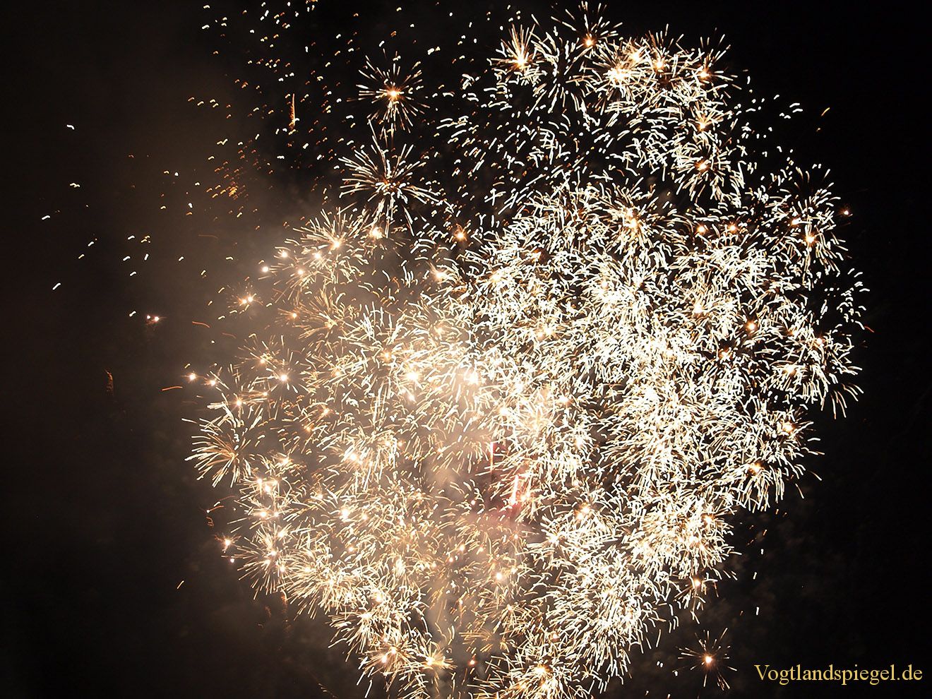 Ein großes leuchtenden Feuerwerk am Abendhimmel über dem Reißberg.