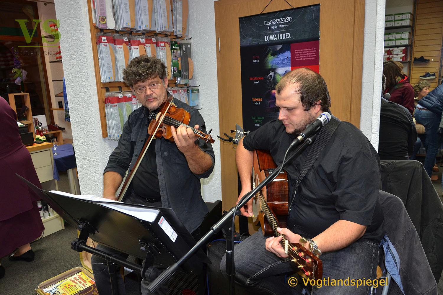 Gerd (l.) und Christian Mallon musizieren traditionell im Schuhgeschäft von Maria Trillitzsch.