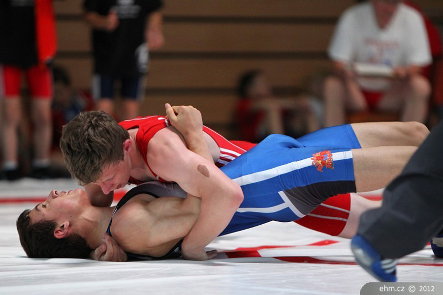 Maximilian Kahnt (rot) bei einem Schultersieg in einem früheren Kampf Foto: ehm.czGRIESHEIM. Wenn man im Bezug zum Ringen von Frankfurt spricht, meint man meist das an der Oder gelegene. Dort existiert der wohl leistungsstärkste deutsche Bundesstützpunkt im griechisch-römischen Stil, der auf nationaler Ebene Medaillengewinner en masse hervorbringt. Aber auch in Frankfurt am Main wird gerungen. Zwar hat die SG Victoria Eckenheim, die den Greizer Ringerverein vor fast genau 60 Jahren in der Endrunde um die deutsche Mannschaftsmeisterschaft bezwang, vor 20 Jahren den Wettkampfbetrieb eingestellt, doch im Ortsteil Griesheim wird weiter auf der Matte gekämpft. Und sogar erfolgreich. So kommt der deutsche Auswahlringer Saba Bolaghi ursprünglich aus diesem Verein. Zum fünften mal lud der ASV Griesheim nun Nachwuchssportler und sportlerinnen zum Franz-Vinson-Turnier ein. Unter den 168 Startern befanden sich auch die Brüder Lucas und Maximilian Kahnt, die mit einer Auswahl des Trainingsstützpunktes Leipzig anreisten. Maximilian, der noch am Nachmittag zuvor mit der zweiten Mannschaft in Zella-Mehlis angetreten war und vier Punkte erkämpfte, startete bei der A-Jugend in der 69 kg-Klasse. Er musste viermal auf die Matte und bezwang dabei alle Kontrahenten. Enriko Agkoidis (Neu-Isenburg) wurde bereits nach 40 Sekunden beim Stande von 7:0 geschultert. Der Kampf gegen Sandro Görisch aus Seeheim, der Zweiter wurde, war nach 1:30 Minuten wegen technischer Überlegenheit (8:0) beendet. Zwei weitere Schultersiege, in nur 66 Sekunden gegen Robert Sparwasser und in 80 Sekunden gegen Jakub Bolatov (Wolfhagen), folgten. Auch wenn die Gegner nicht zur absoluten deutschen Spitzenklasse gehörten lässt die Bilanz von 28:0 Punkten aufhorchen. Die Goldmedaille war der verdiente Lohn. Sein jüngerer Bruder Lucas bereitete sich bei der B-Jugend auf die 42 kg-Klasse vor und wog zum offiziellen Wiegen 41,5 kg. Da aber in dieser Klasse sowie im 46 kg-Limit keine Aktiven antraten, musste er als Leichtester in der 50 kg-Klasse antreten. Er begann seinen Eröffnungskampf gegen Maykies Blechschmidt (Neu-Isenburg) mit einem sehr schnellen Schultersieg. Im Poolfinale unterlag er dem deutlich schwereren Fillippos Filippidis vom Gastgeberverein mit technischer Unterlegenheit. Im Kampf um die Bronzemedaille traf er auf Yüksel Mincher, einen weiteren Sportler des ASV Griesheim. Hier konnte der Greizer nochmals sein ganzes Können abrufen und gewann sicher mit 7:2 Punkten. Ein anstrengendes aber auch erfolgreiches Wochenende fand einen positiven Abschluss. Erhard Schmelzer @08.10.2013