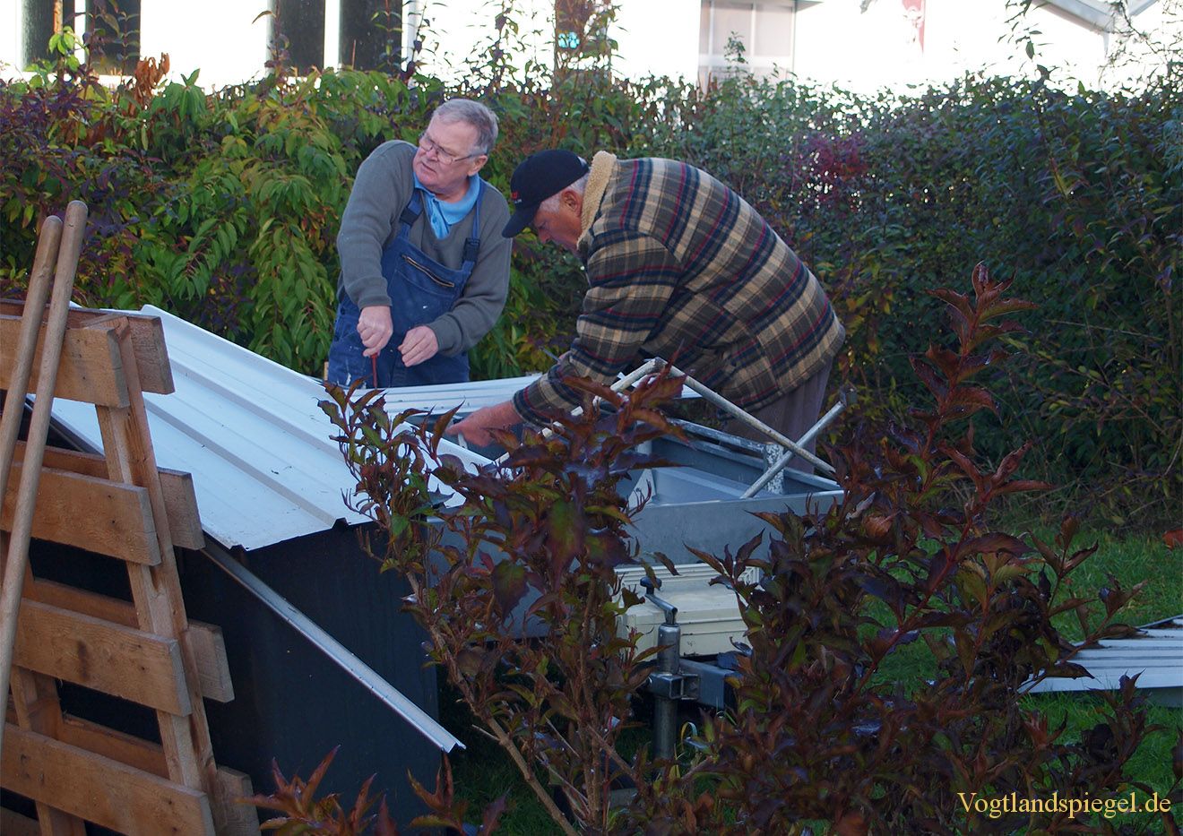 Der Vereinsvorsitzende des ASV Gommla 1882 Ulrich Prüfer bei der Dachrinnenreparatur.