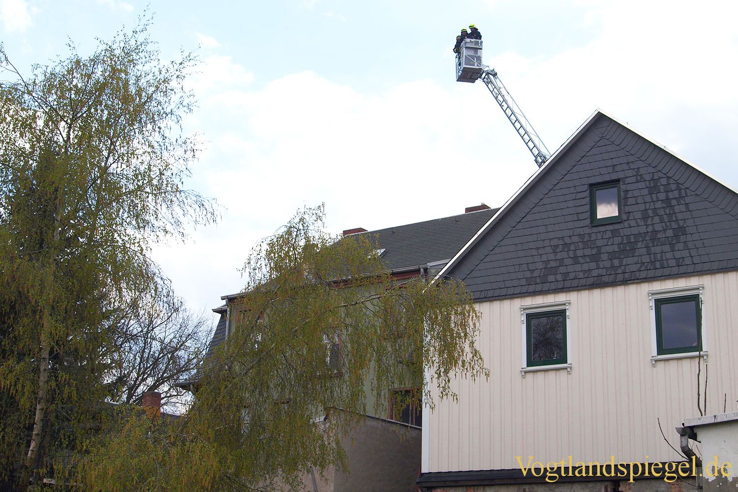 Mit dem Krankorb nach oben – die Kameraden der FFW Gommla haben alles im Blick.