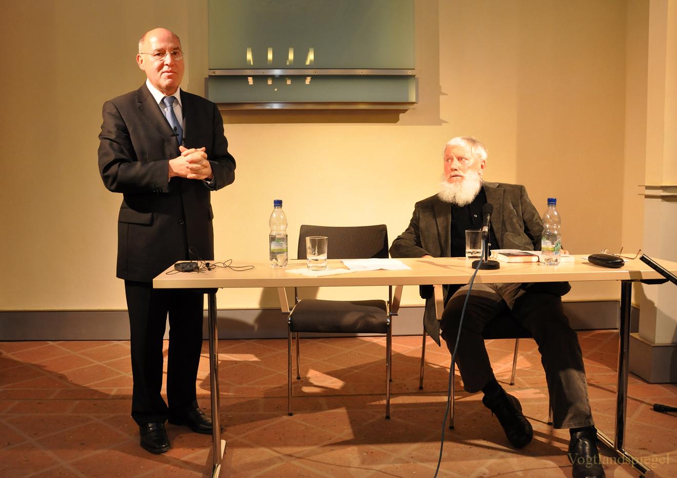 Der Referent der Veranstaltung »Prominente im Gespräch«, Dr. Gregor Gysi bei seinem Vortrag Nachdenken über Deutschland im Fürstensaal des Oberen Schlosses Greiz.