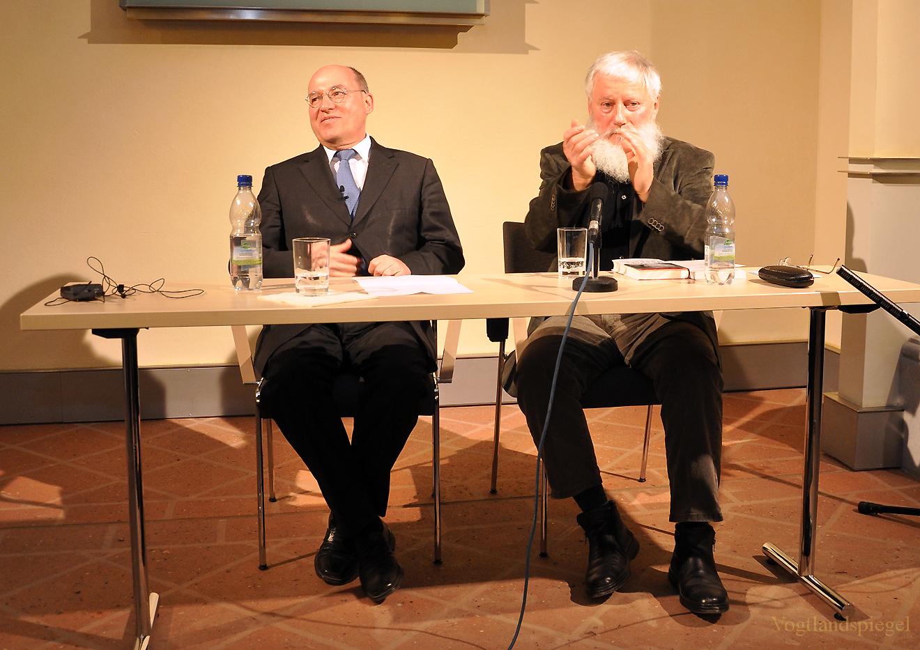Nicht nur Harald Seidel (r.) applaudiert dem Referenten Dr. Gregor Gysi, sondern auch die Veranstaltungsgäste zeigen sich begeistert.
