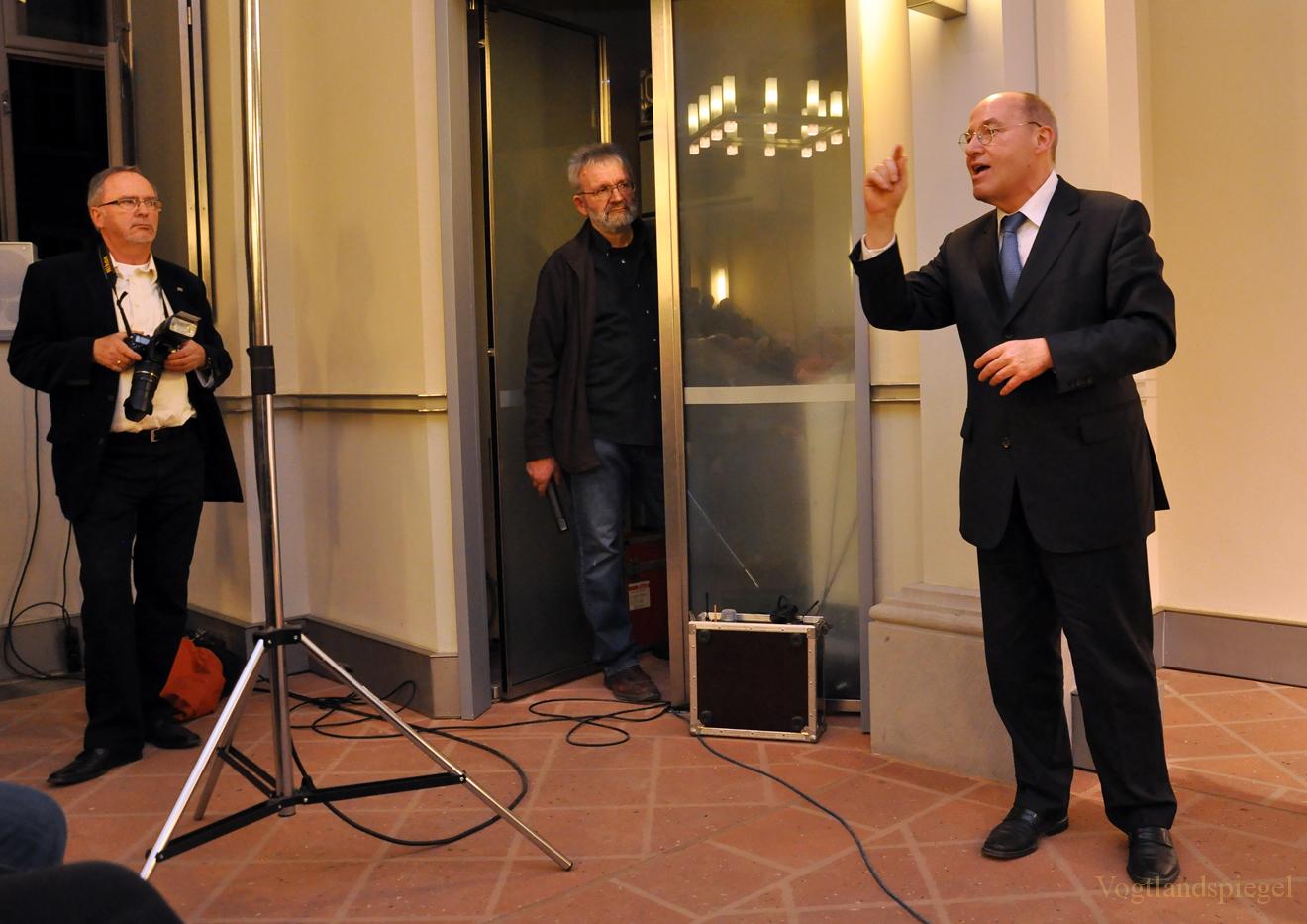 Mit seinem Vortrag begeisterte Gregor Gysi (r.) die zahlreichen Gäste im Fürstensaal des Oberen Schlosses Greiz.